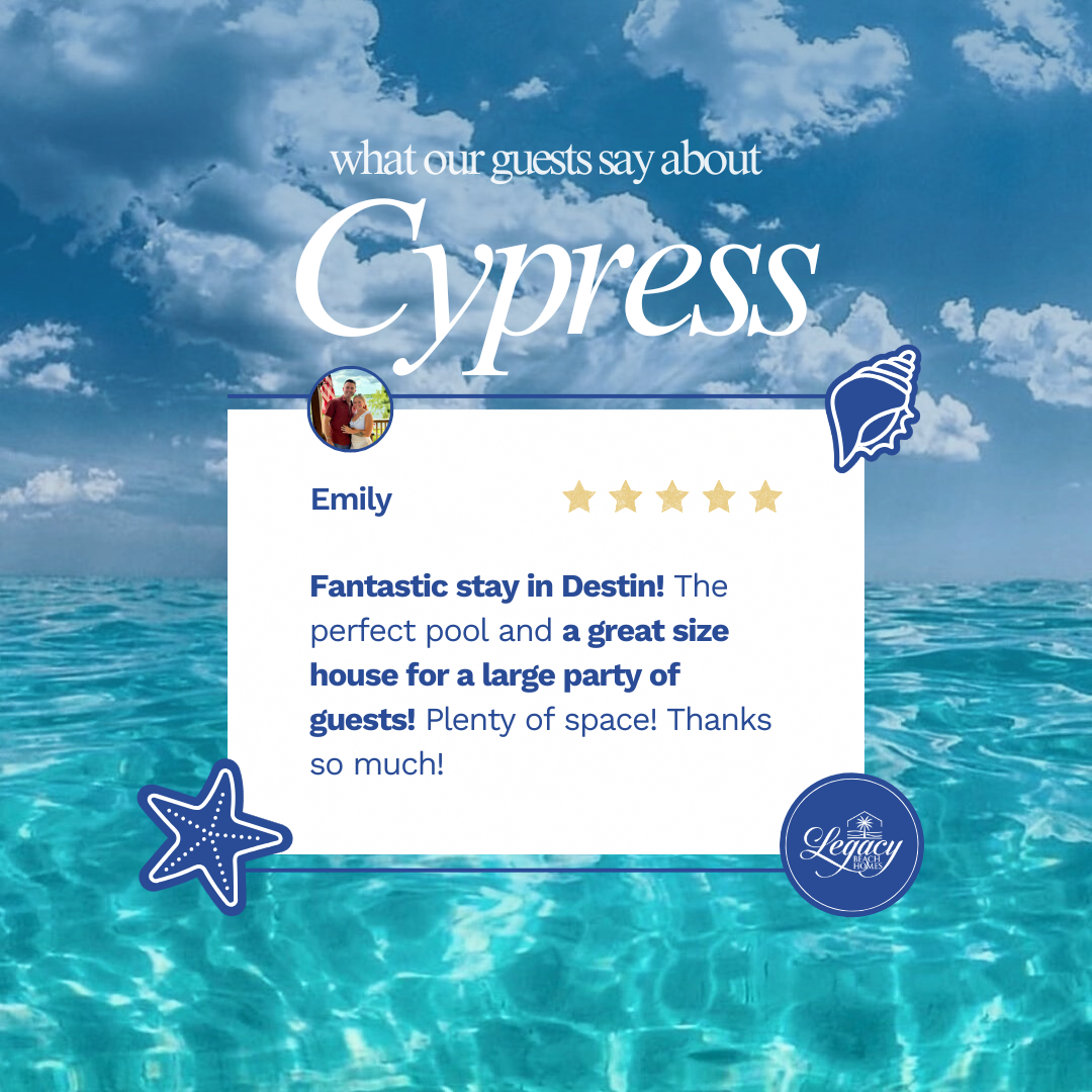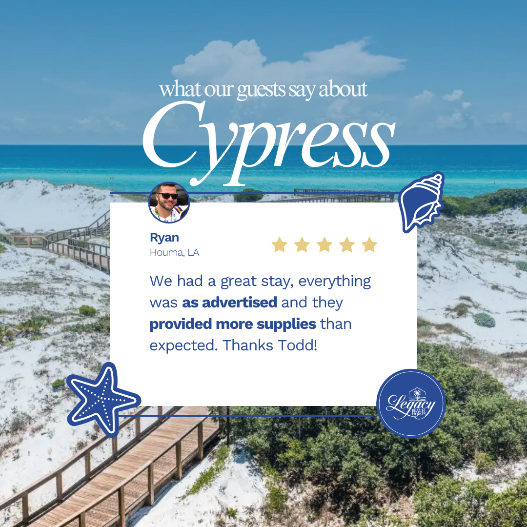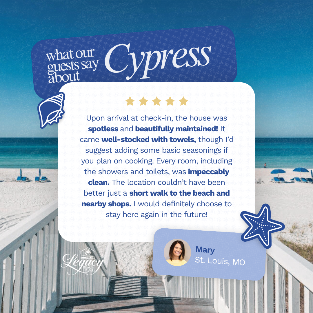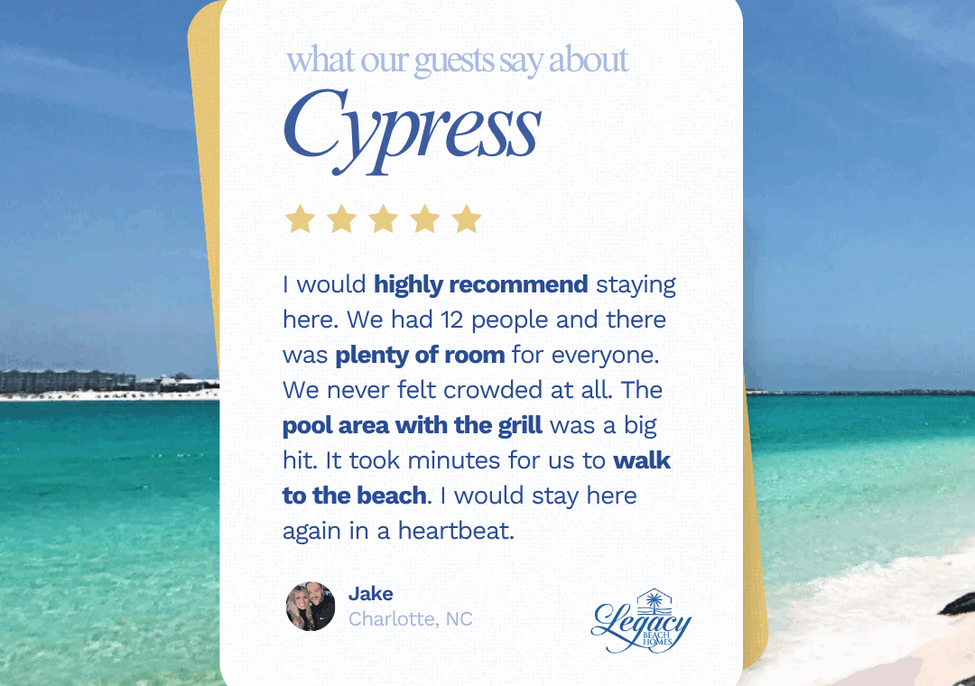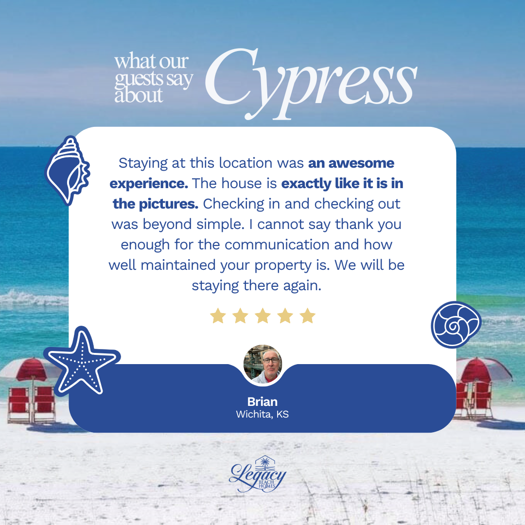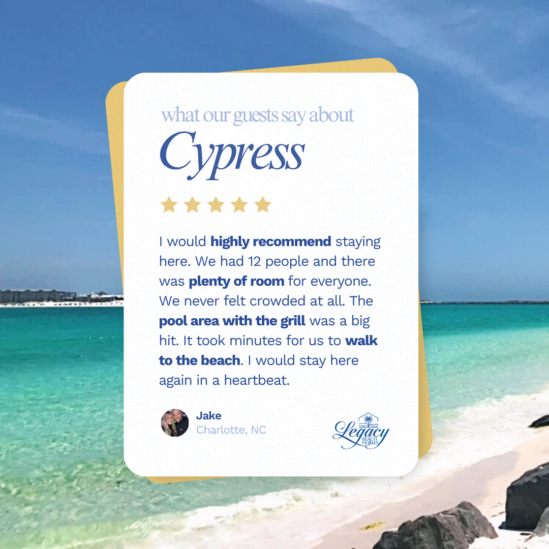 With spacious interiors, two living areas, and a prime location near Destin’s best restaurants and attractions, Cypress promises a memorable, stress-free vacation.