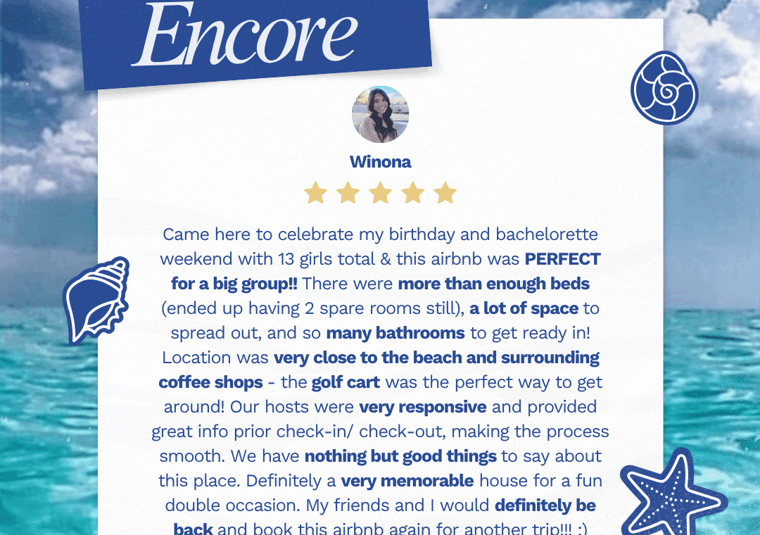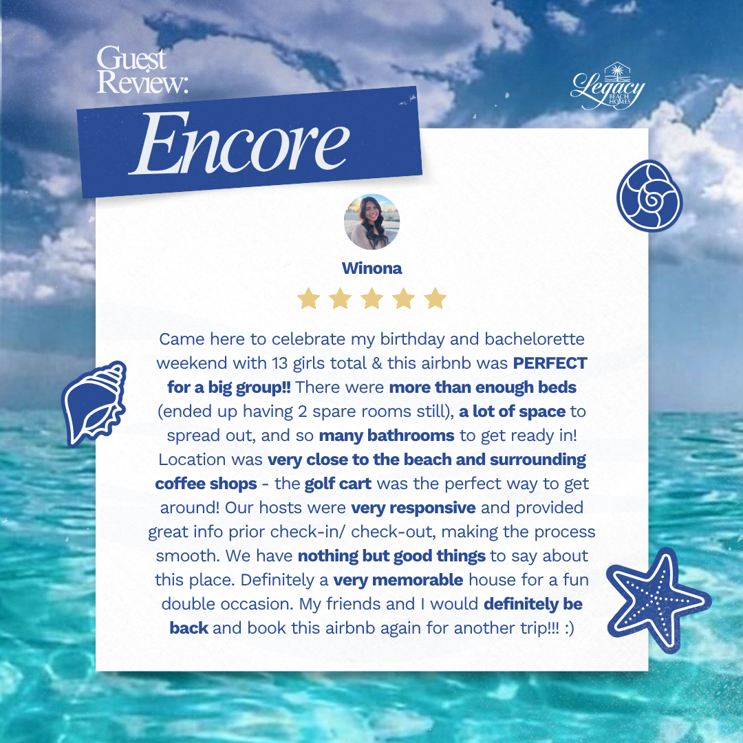 • Came here to celebrate my birthday and bachelorette weekend with 13 girls total & this airbnb was PERFECT for a big group!! There were more than enough beds (ended up having 2 spare rooms still), a lot of space to spread out, and so many bathrooms to get ready in! Location was very close to the beach and surrounding coffee shops - the golf cart was the perfect way to get around! Our hosts were very responsive and provided great info prior check-in/ check-out, making the process smooth. We have nothing but good things to say about this place. Definitely a very memorable house for a fun double occasion. My friends and I would definitely be back and book this airbnb again for another trip!!! :)