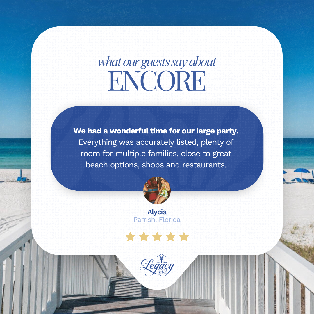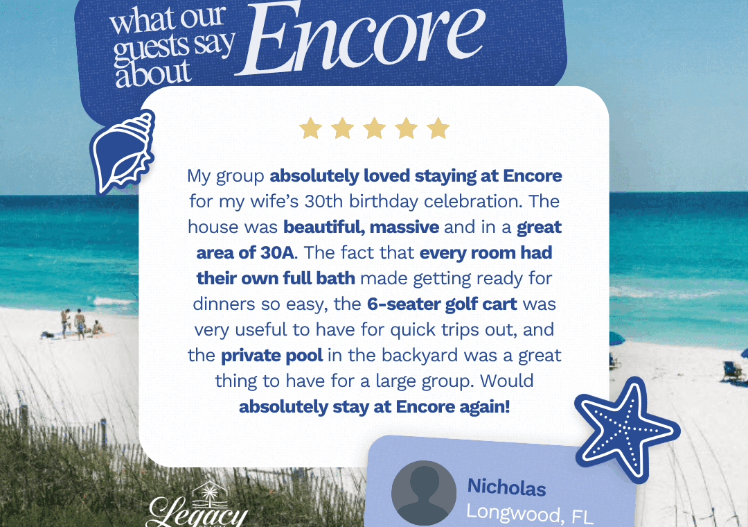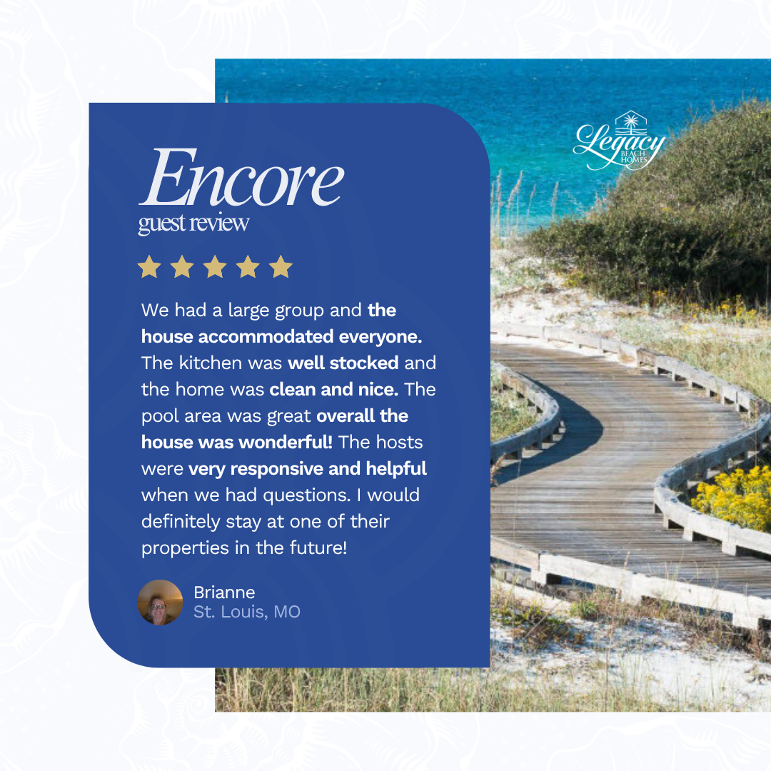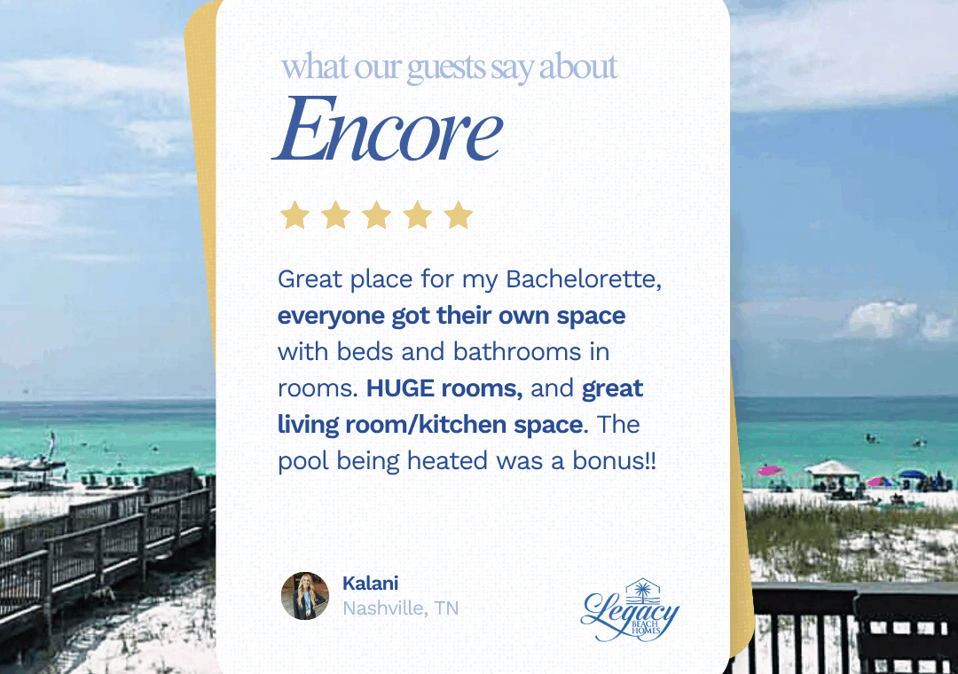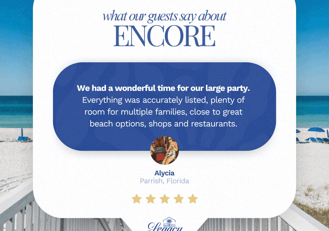 Legacy Beach Homes focuses on building new, large beach homes that sleep 20+ people with private pools and offer sufficient parking for these large groups.