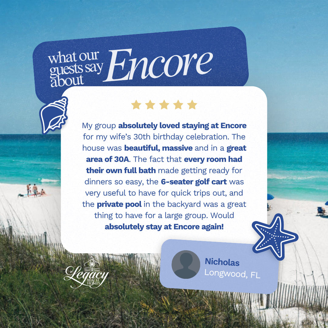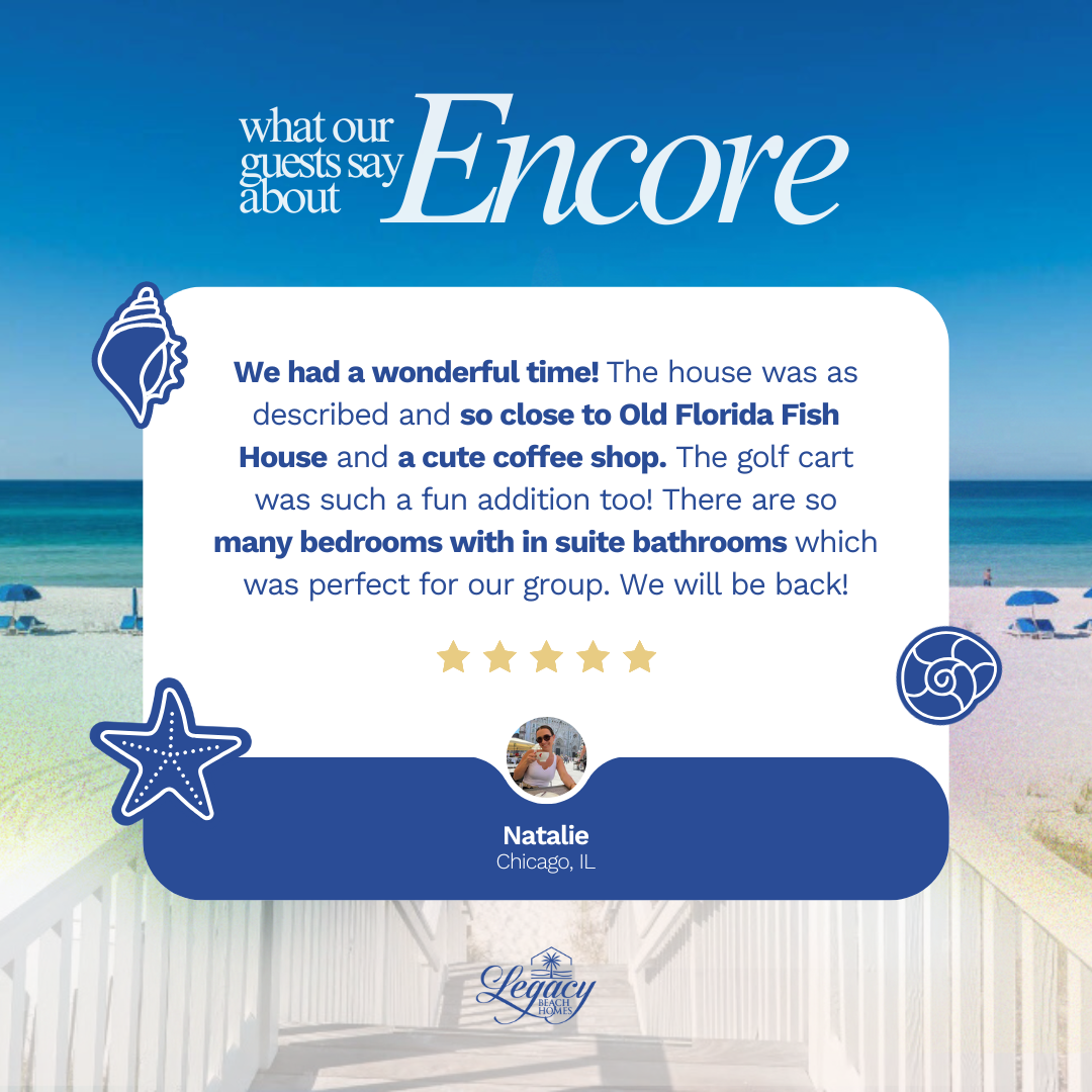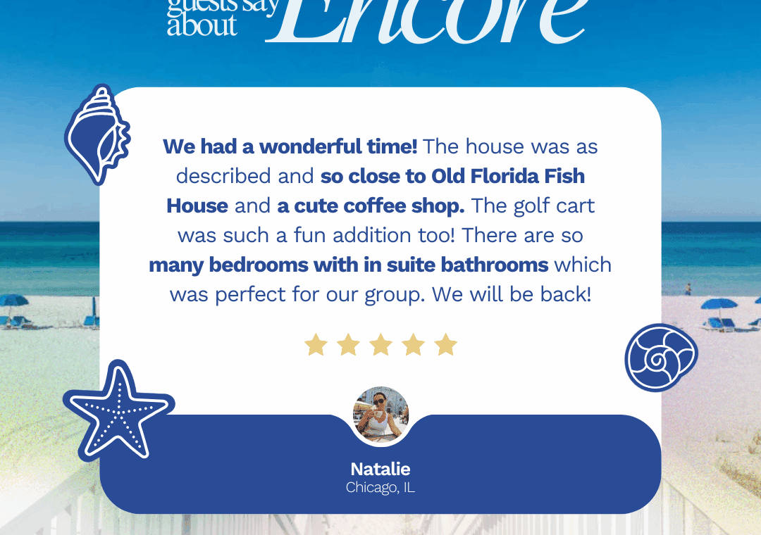 • We had a wonderful time! The house was as described and so close to Old Florida Fish House and a cute coffee shop. The golf cart was such a fun addition too! There are so many bedrooms with in suite bathrooms which was perfect for our group. We will be back!