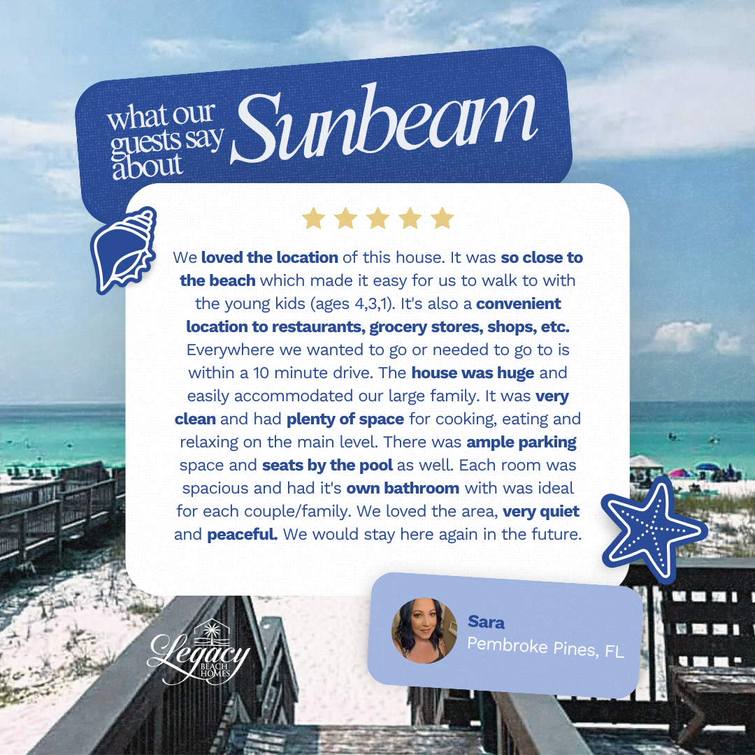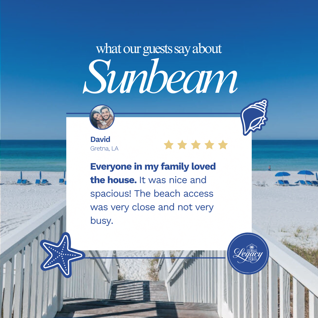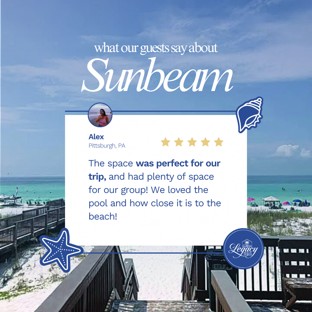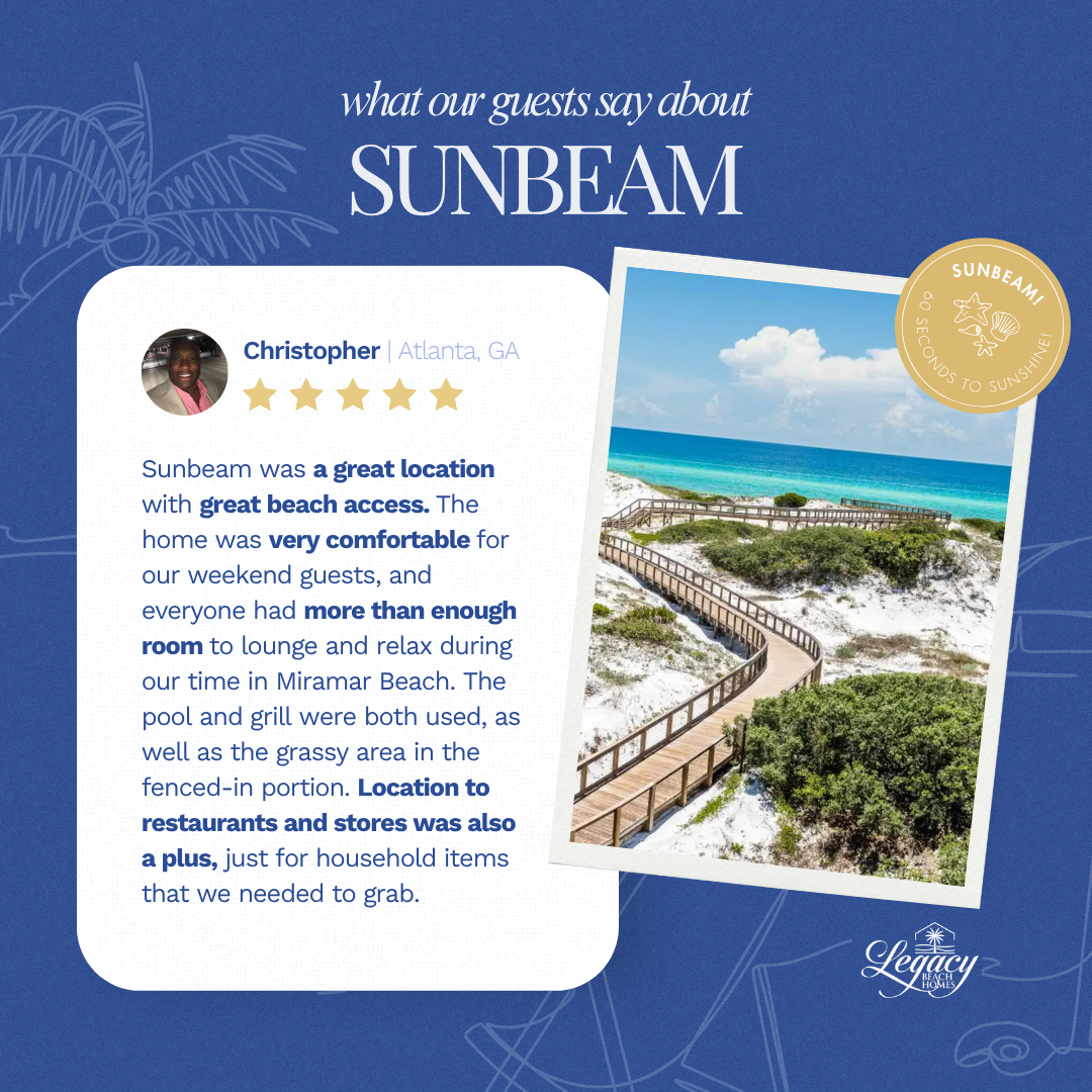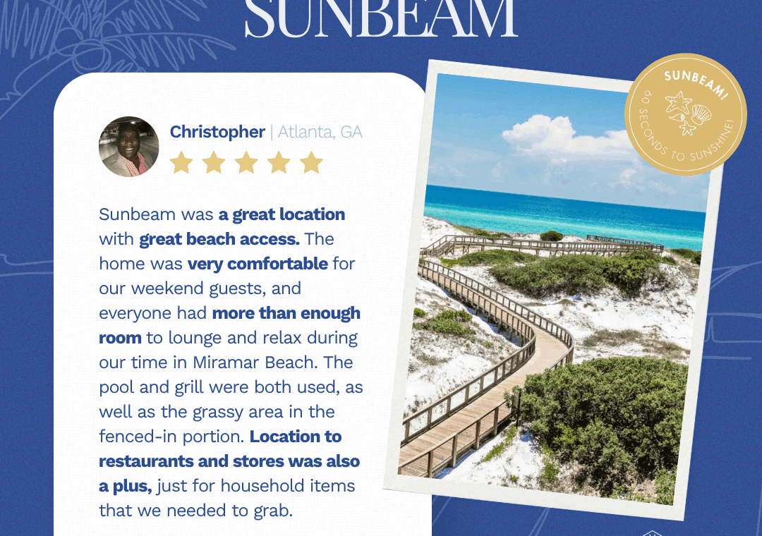 Sunbeam was a great location with great beach access. The home was very comfortable for our weekend guests, and everyone had more than enough room to lounge and relax during our time in Miramar Beach. The pool and grill were both used, as well as the grassy area in the fenced-in portion. Location to restaurants and stores was also a plus, just for household items that we needed to grab.