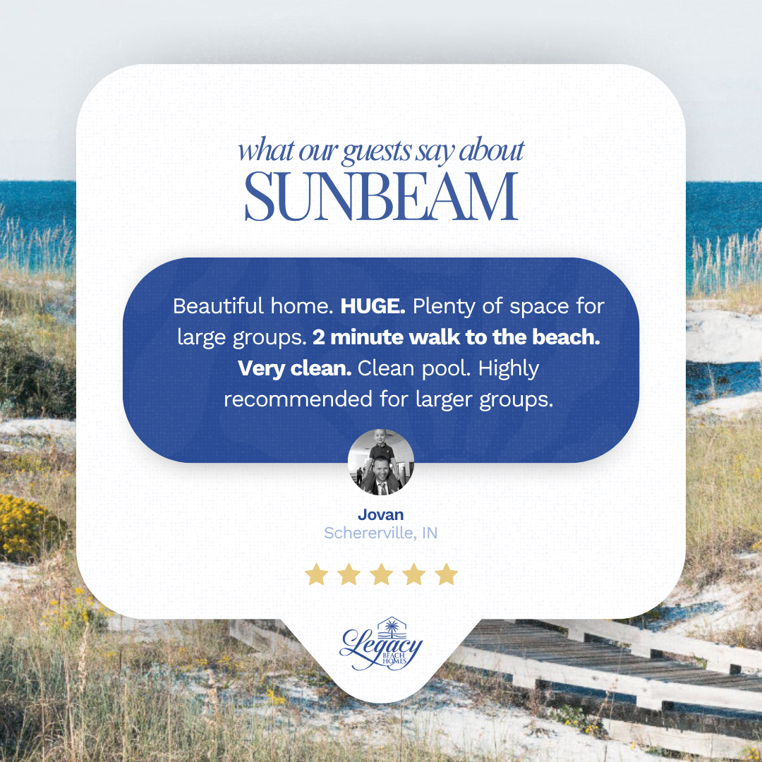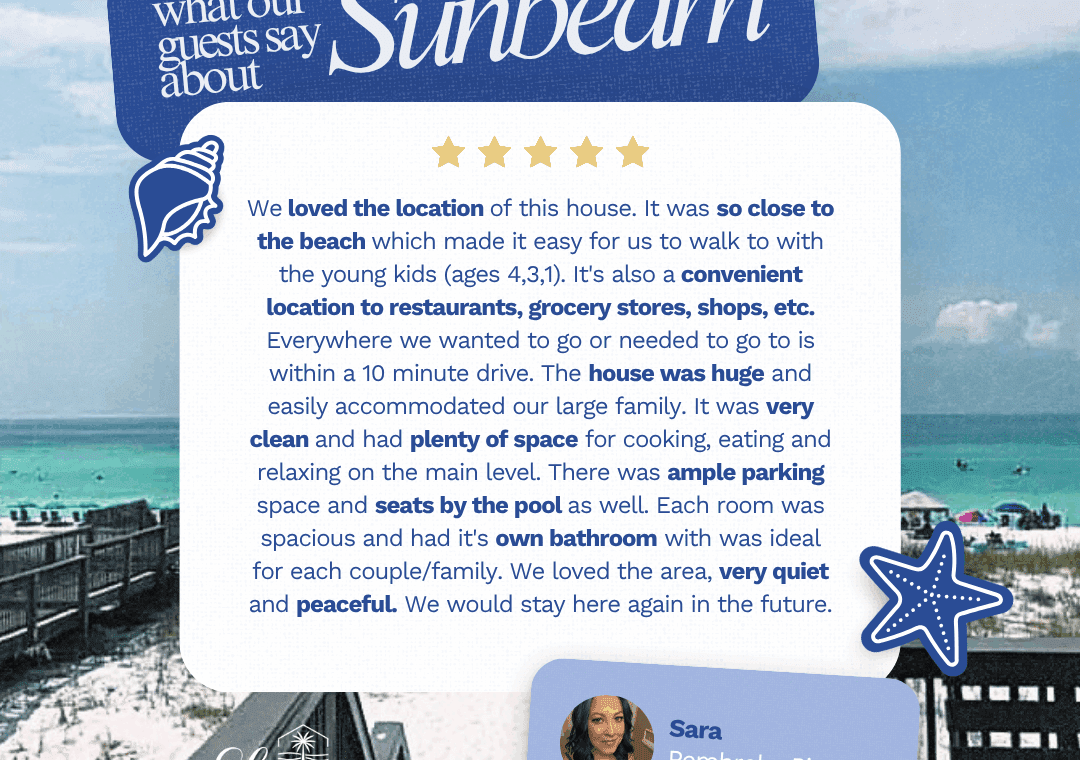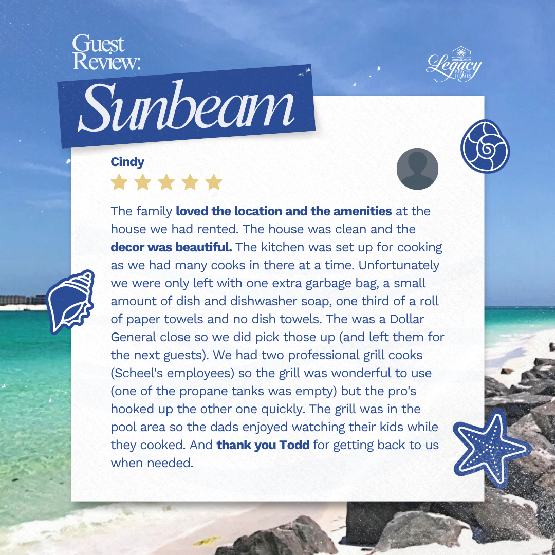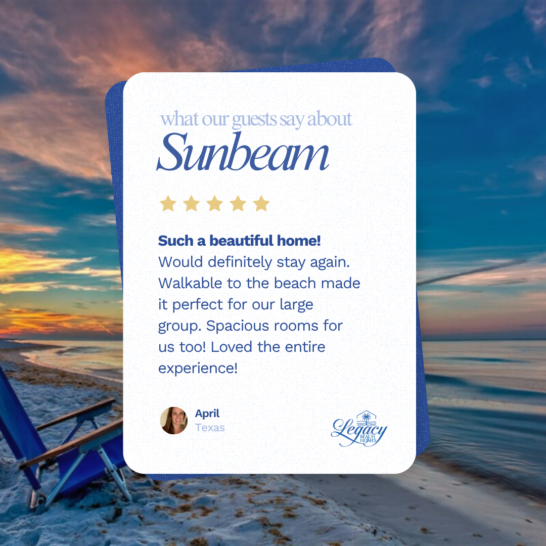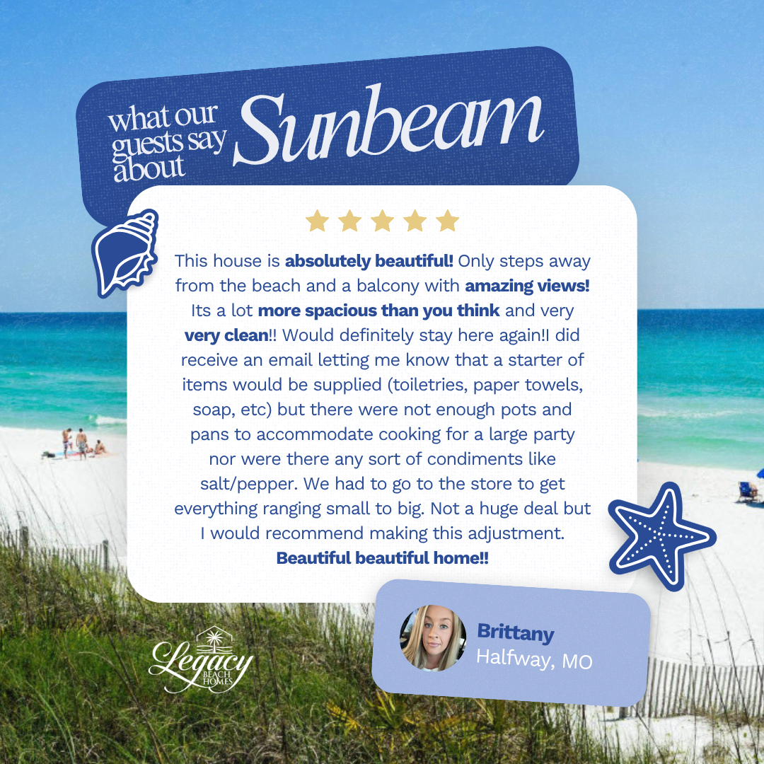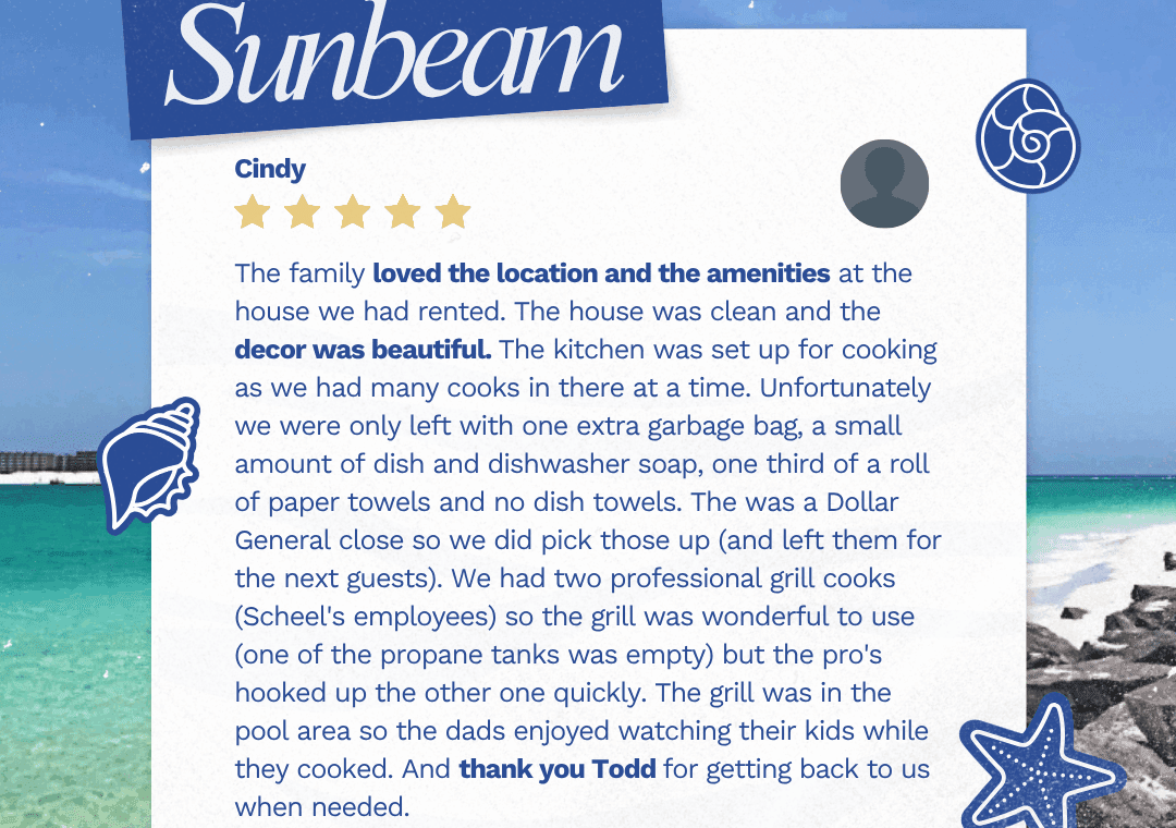 Sunbeam was a great location with great beach access. The home was very comfortable for our weekend guests, and everyone had more than enough room to lounge and relax during our time in Miramar Beach. The pool and grill were both used, as well as the grassy area in the fenced-in portion. Location to restaurants and stores was also a plus, just for household items that we needed to grab.
