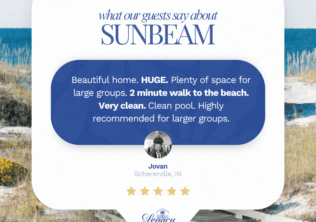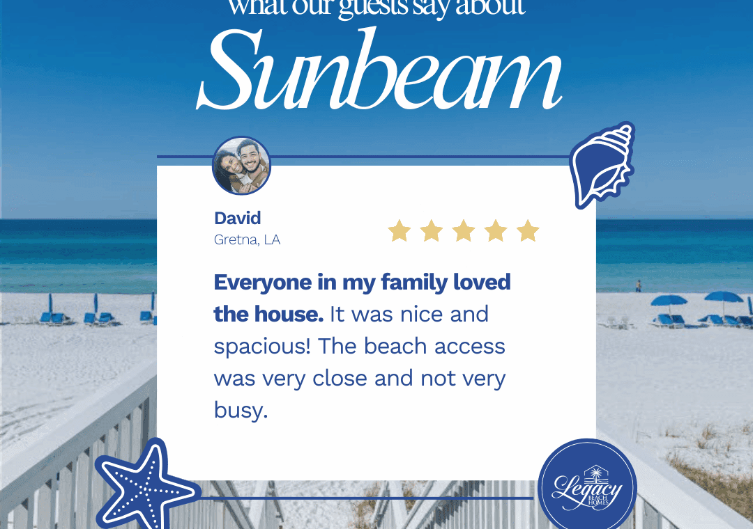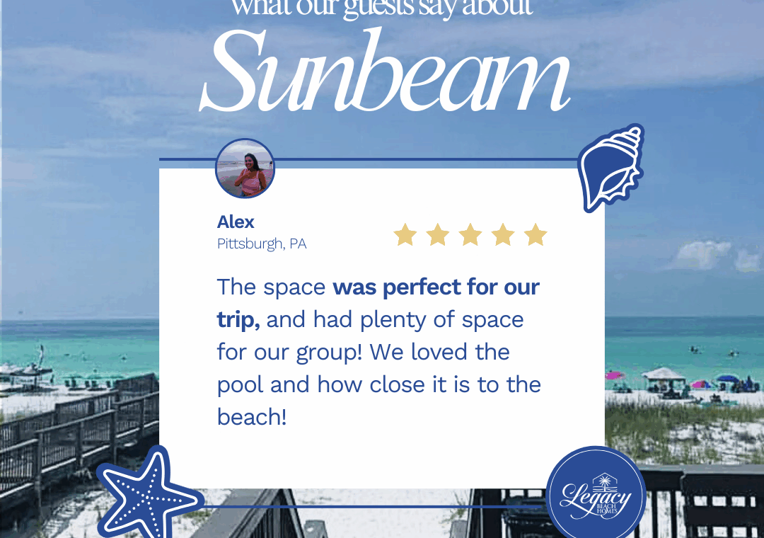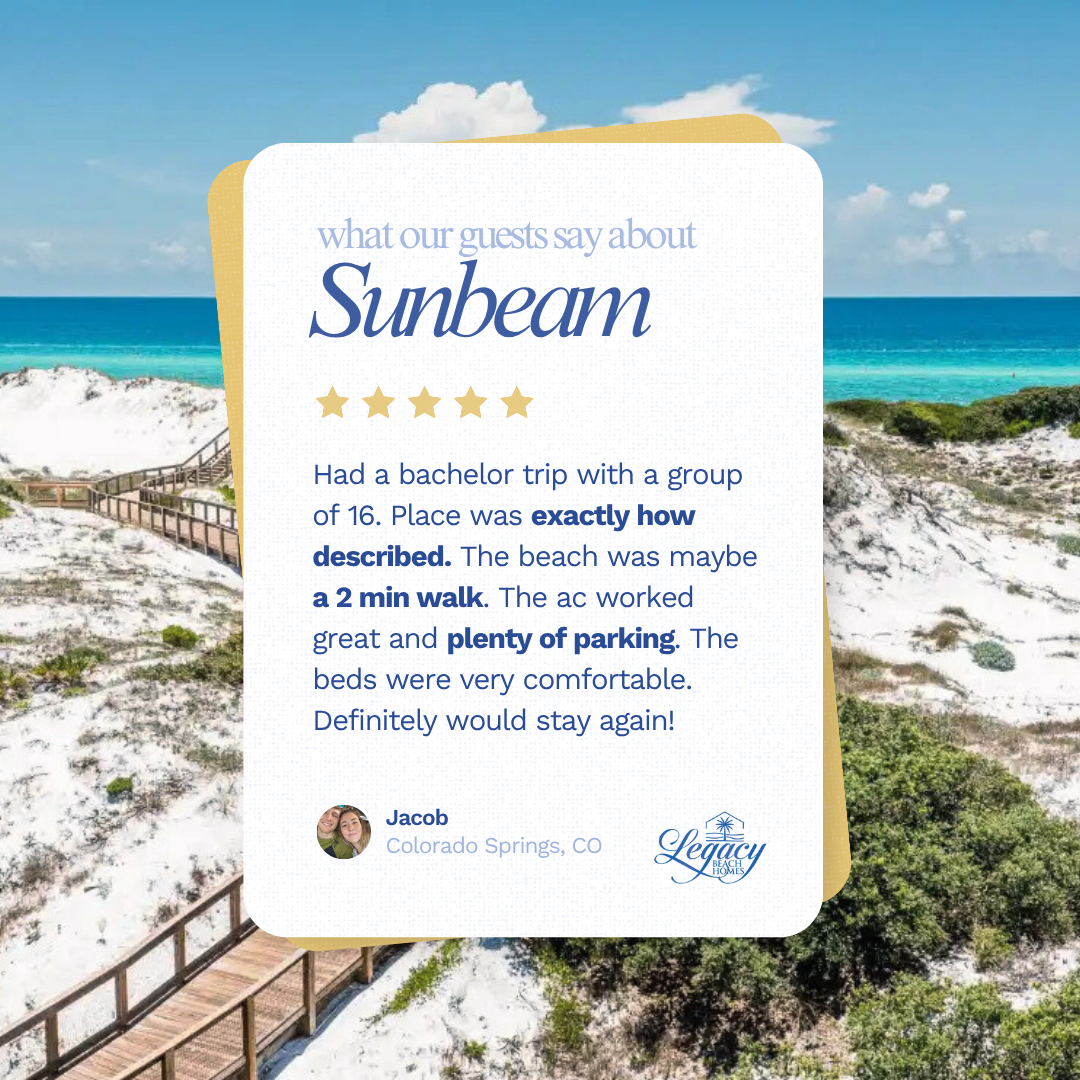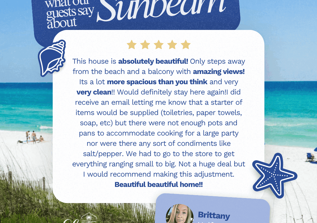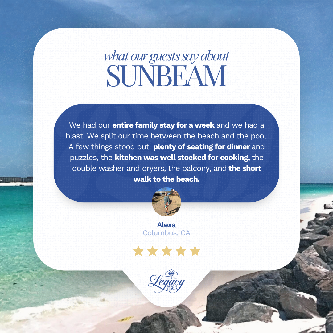 Sunbeam was a great location with great beach access. The home was very comfortable for our weekend guests, and everyone had more than enough room to lounge and relax during our time in Miramar Beach. The pool and grill were both used, as well as the grassy area in the fenced-in portion. Location to restaurants and stores was also a plus, just for household items that we needed to grab.