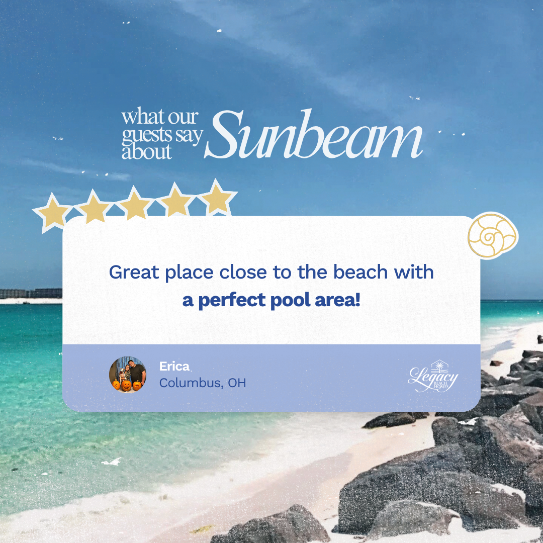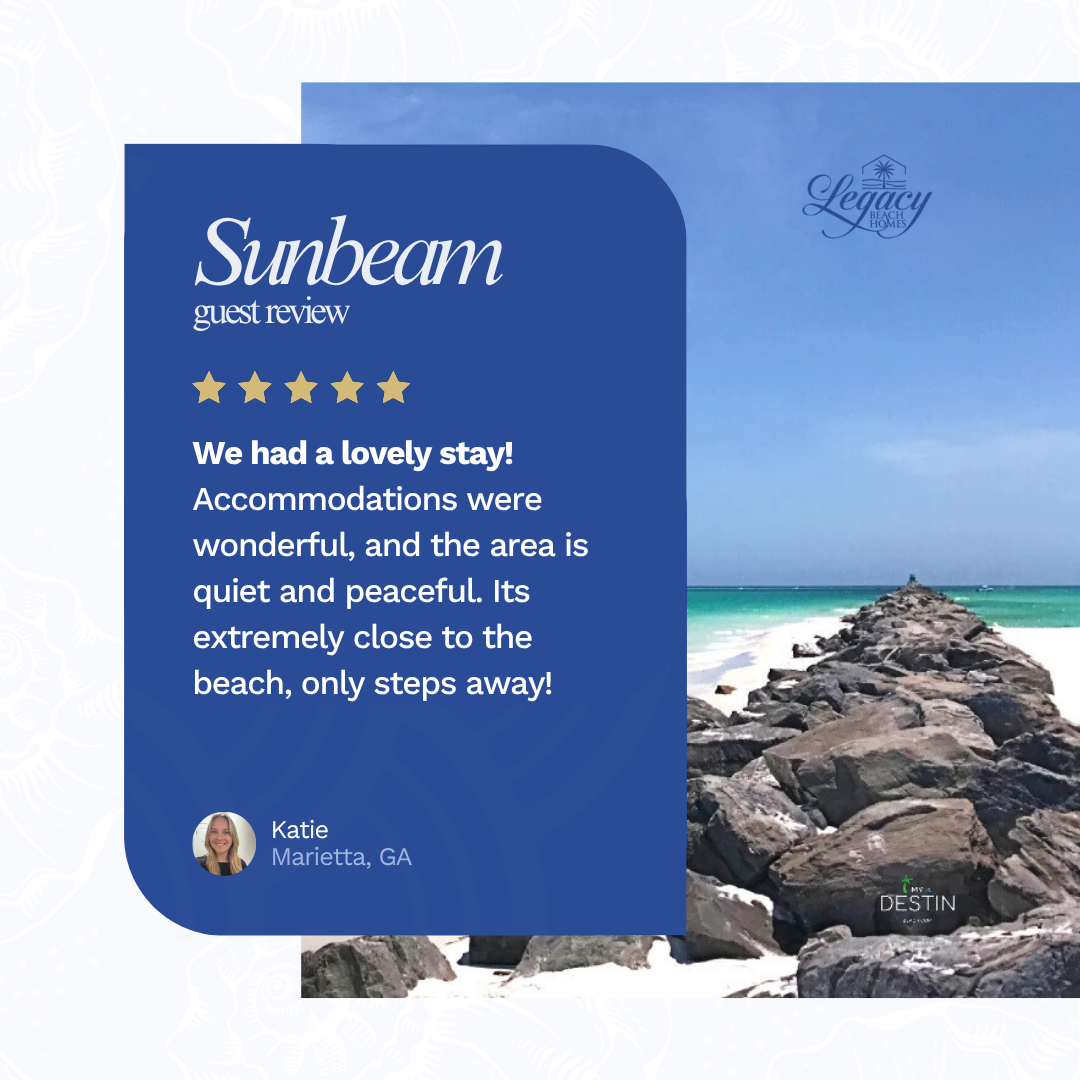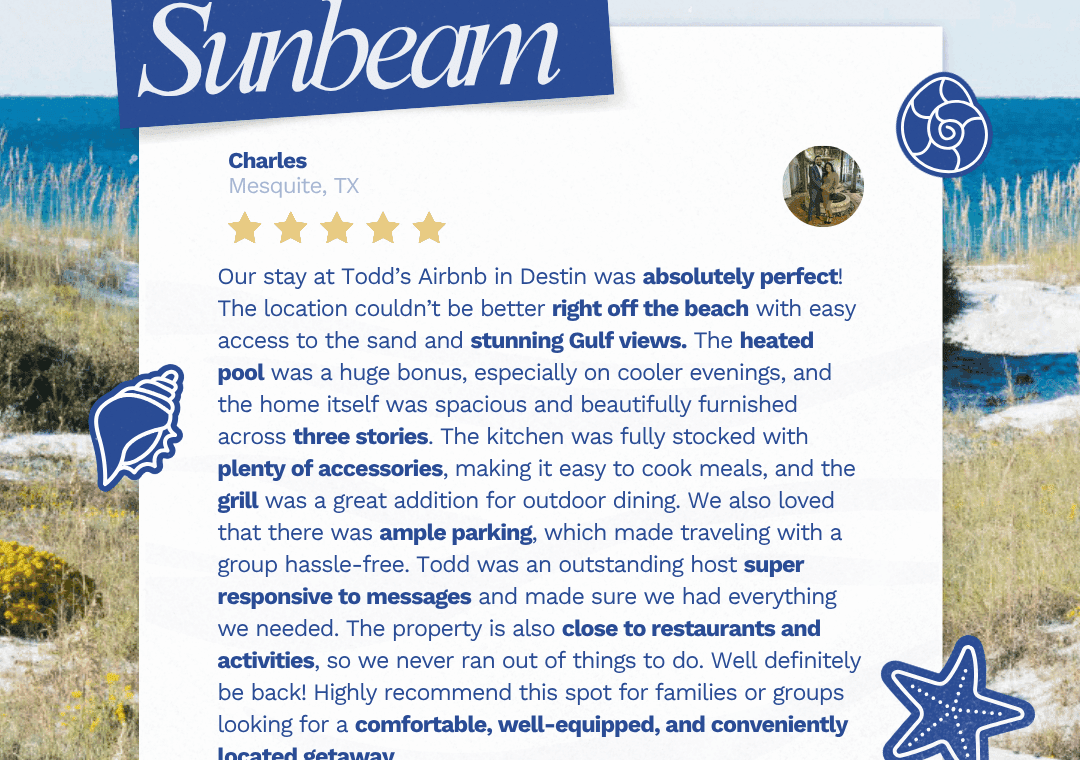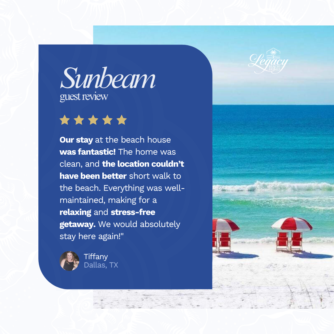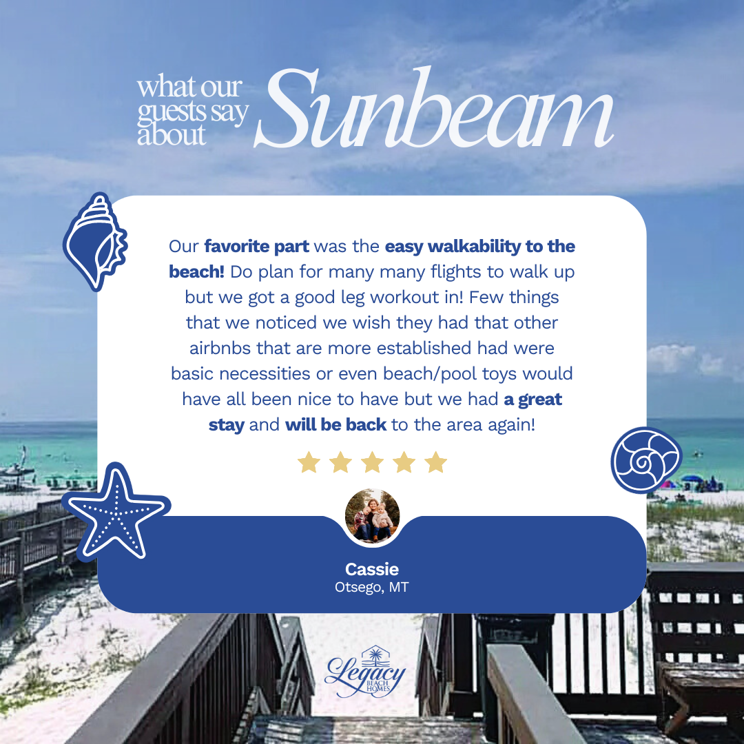 Sunbeam was a great location with great beach access. The home was very comfortable for our weekend guests, and everyone had more than enough room to lounge and relax during our time in Miramar Beach. The pool and grill were both used, as well as the grassy area in the fenced-in portion. Location to restaurants and stores was also a plus, just for household items that we needed to grab.