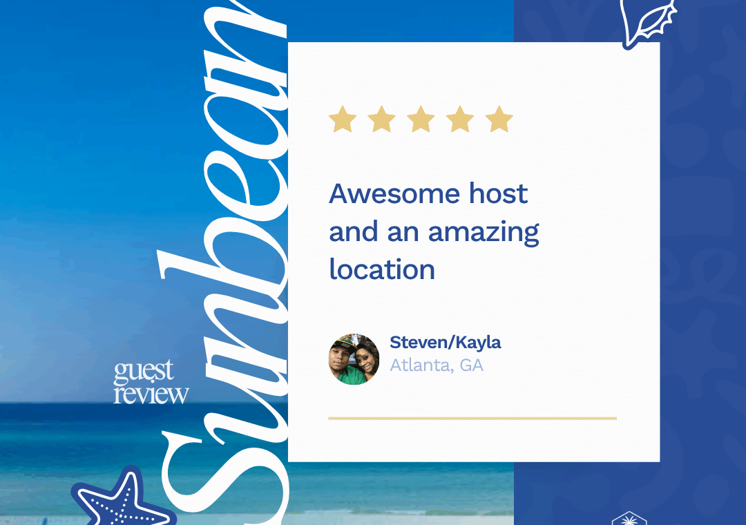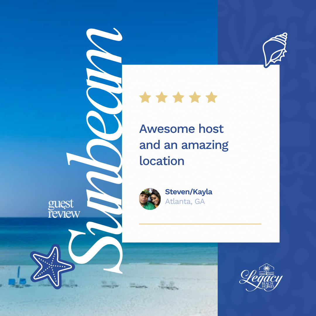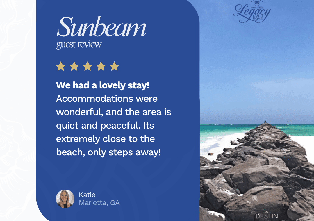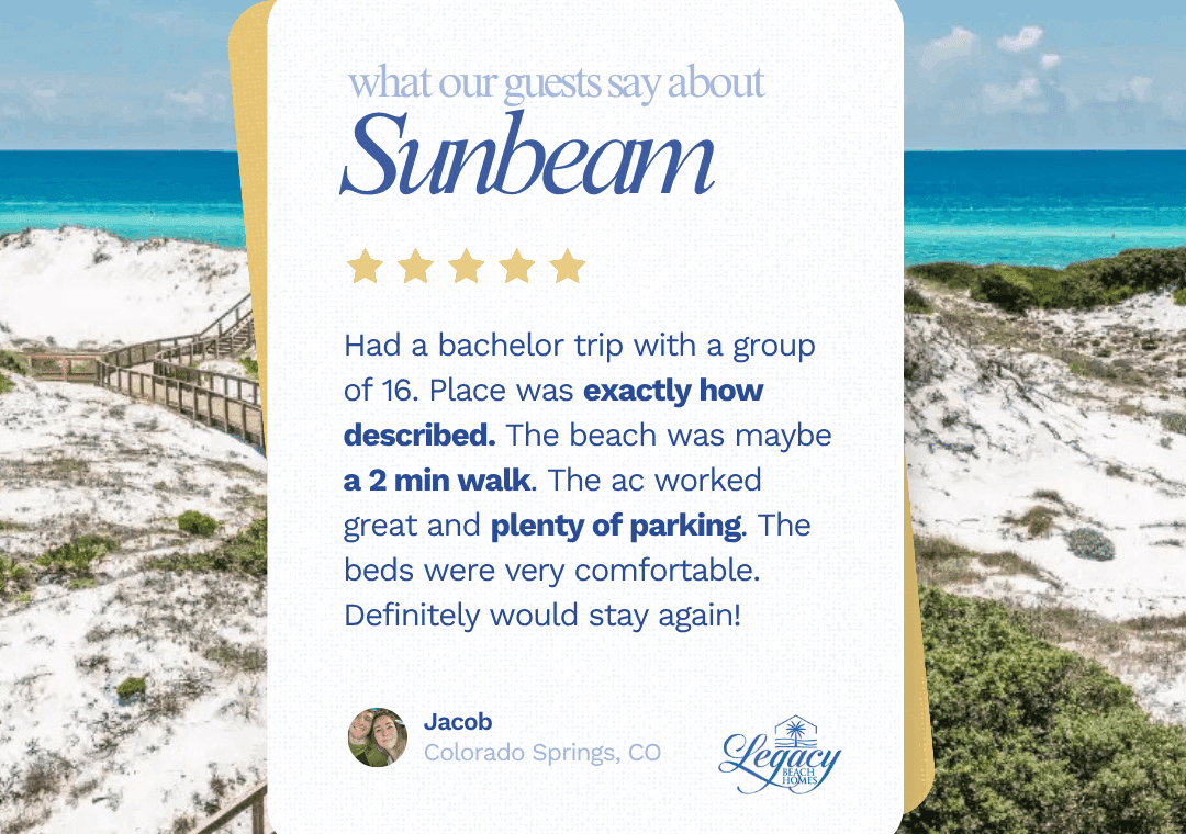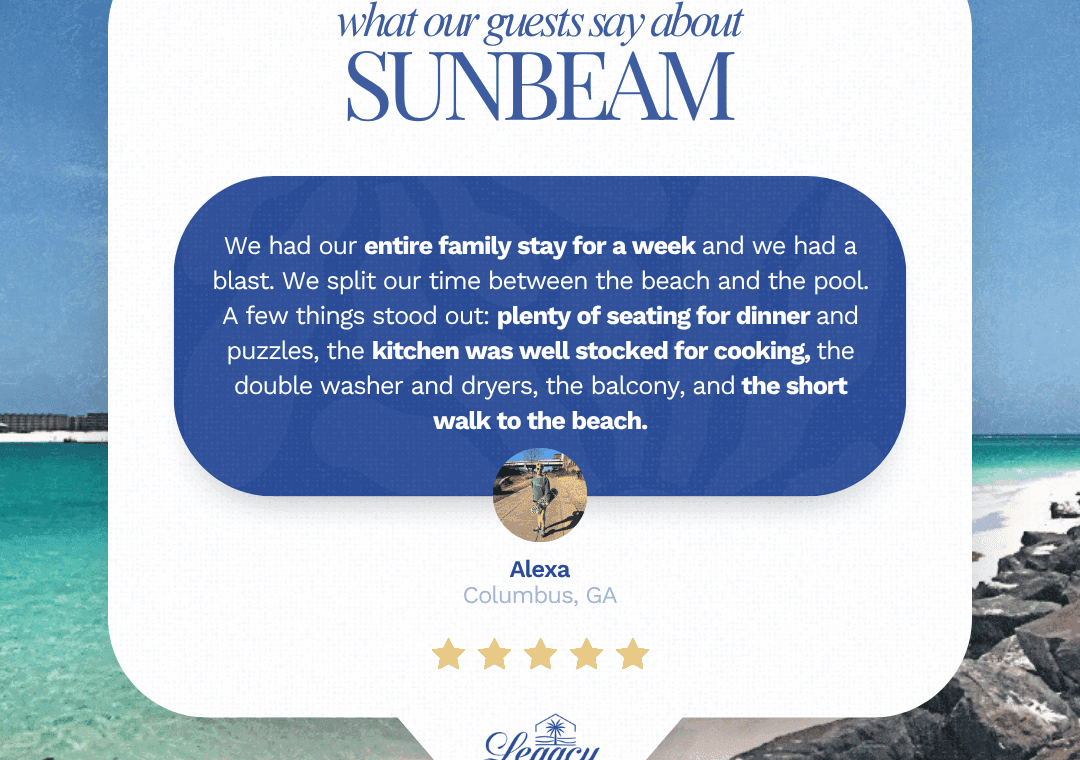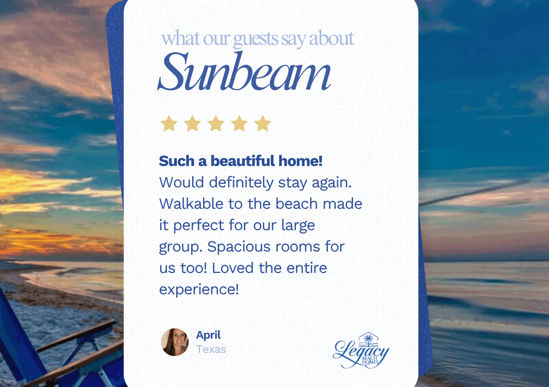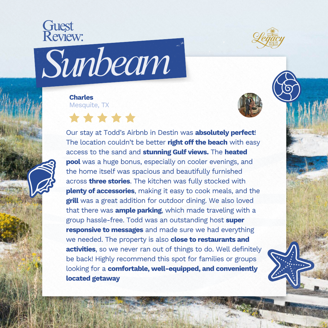 Sunbeam was a great location with great beach access. The home was very comfortable for our weekend guests, and everyone had more than enough room to lounge and relax during our time in Miramar Beach. The pool and grill were both used, as well as the grassy area in the fenced-in portion. Location to restaurants and stores was also a plus, just for household items that we needed to grab.