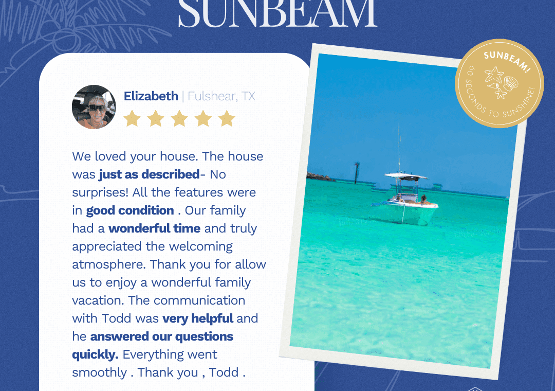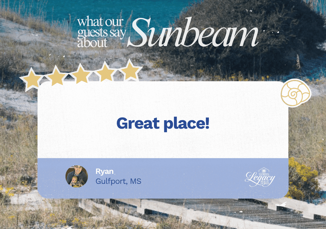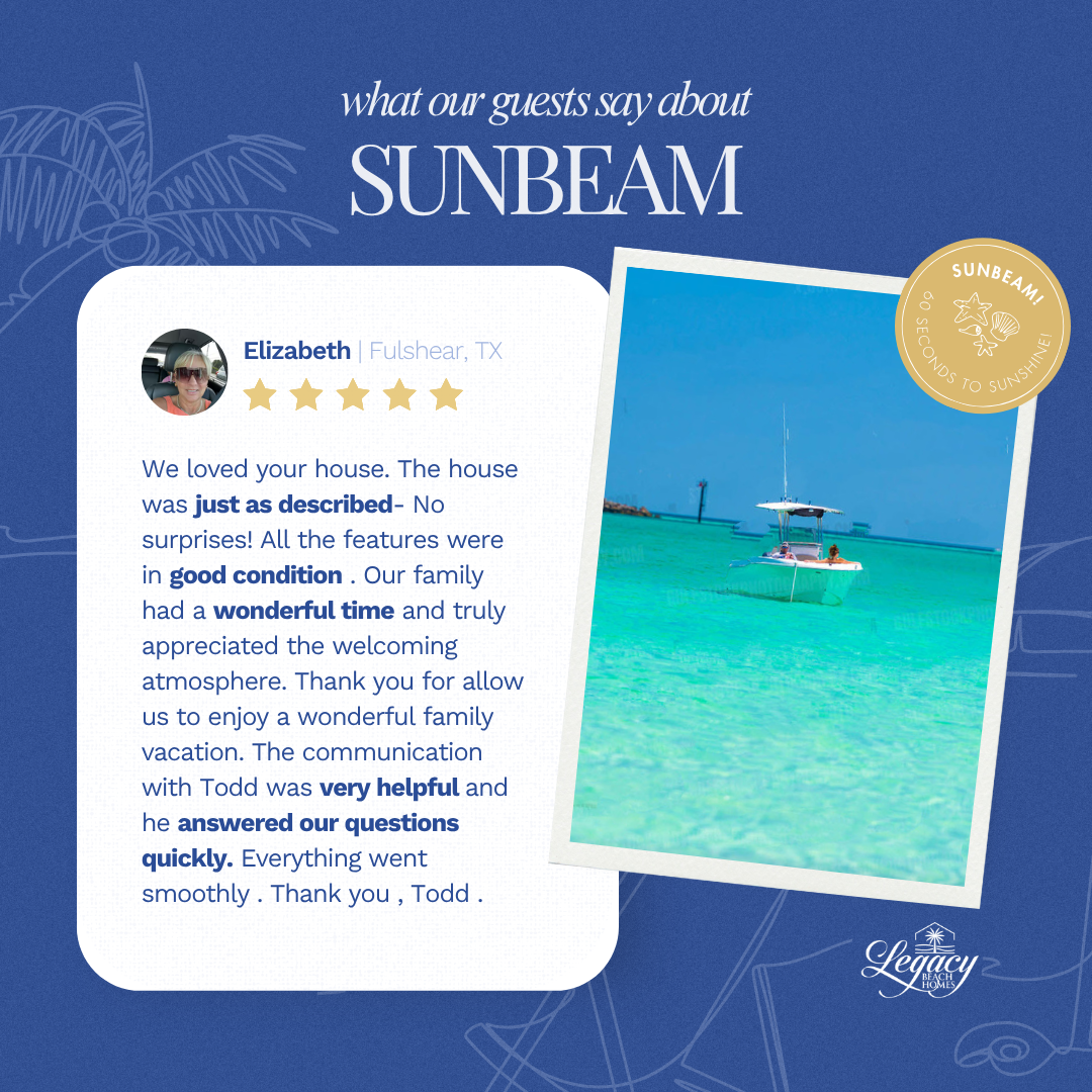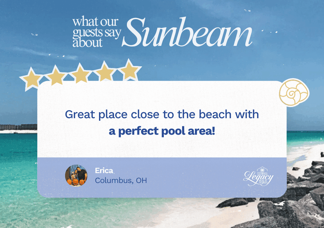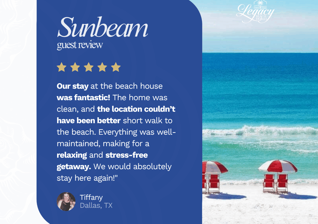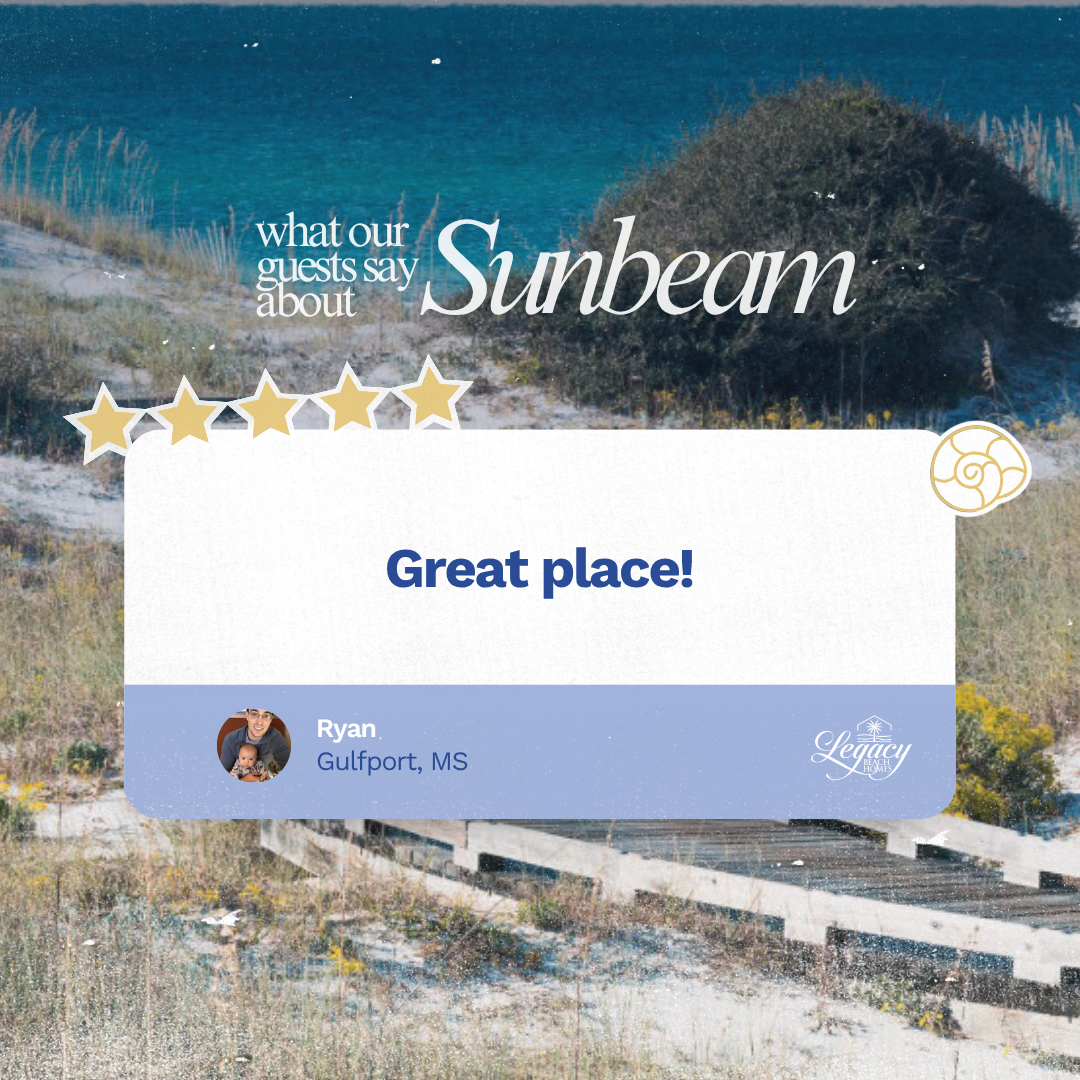 Sunbeam was a great location with great beach access. The home was very comfortable for our weekend guests, and everyone had more than enough room to lounge and relax during our time in Miramar Beach. The pool and grill were both used, as well as the grassy area in the fenced-in portion. Location to restaurants and stores was also a plus, just for household items that we needed to grab.