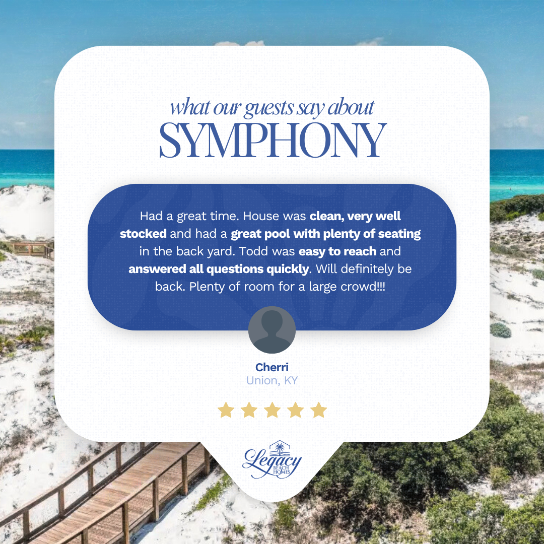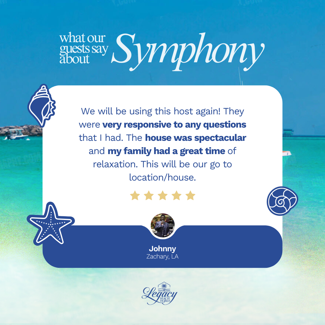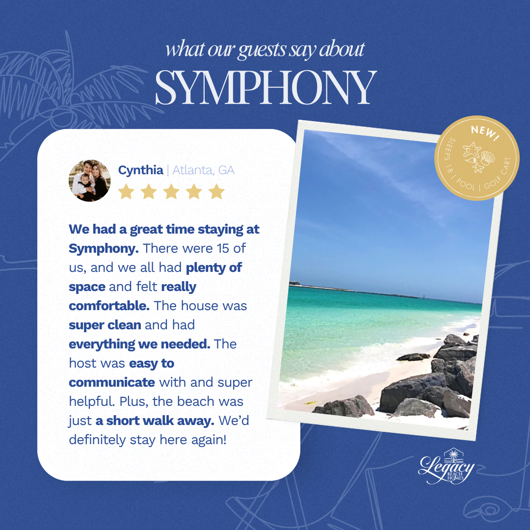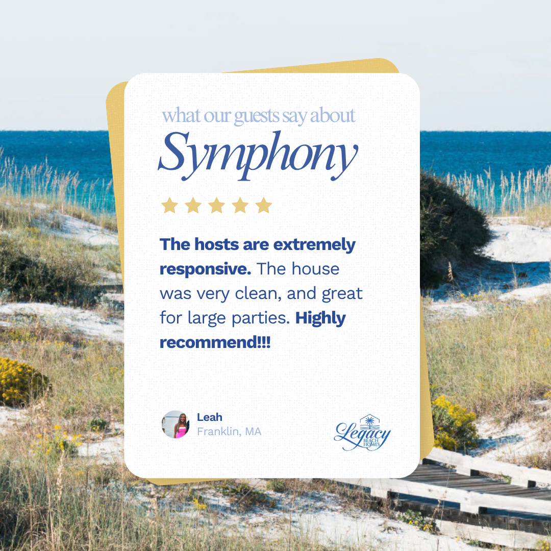 We had a great time staying at Symphony. There were 15 of us, and we all had plenty of space and felt really comfortable. The house was super clean and had everything we needed. The host was easy to communicate with and super helpful. Plus, the beach was just a short walk away. Wed definitely stay here again!