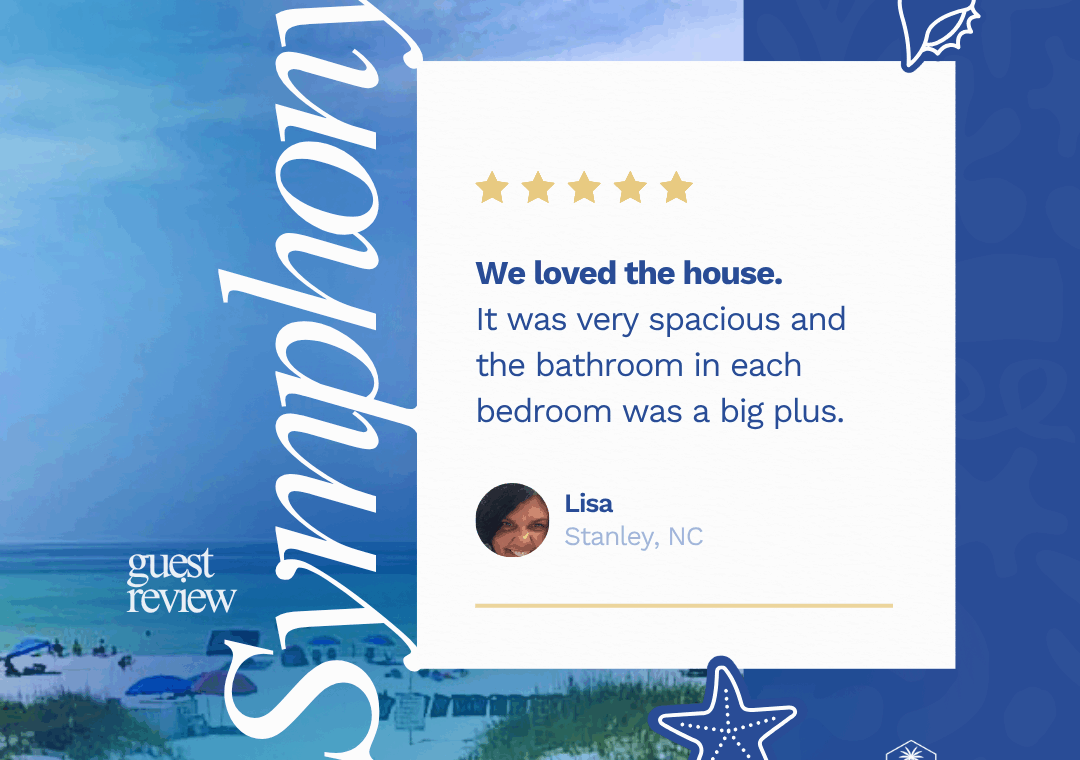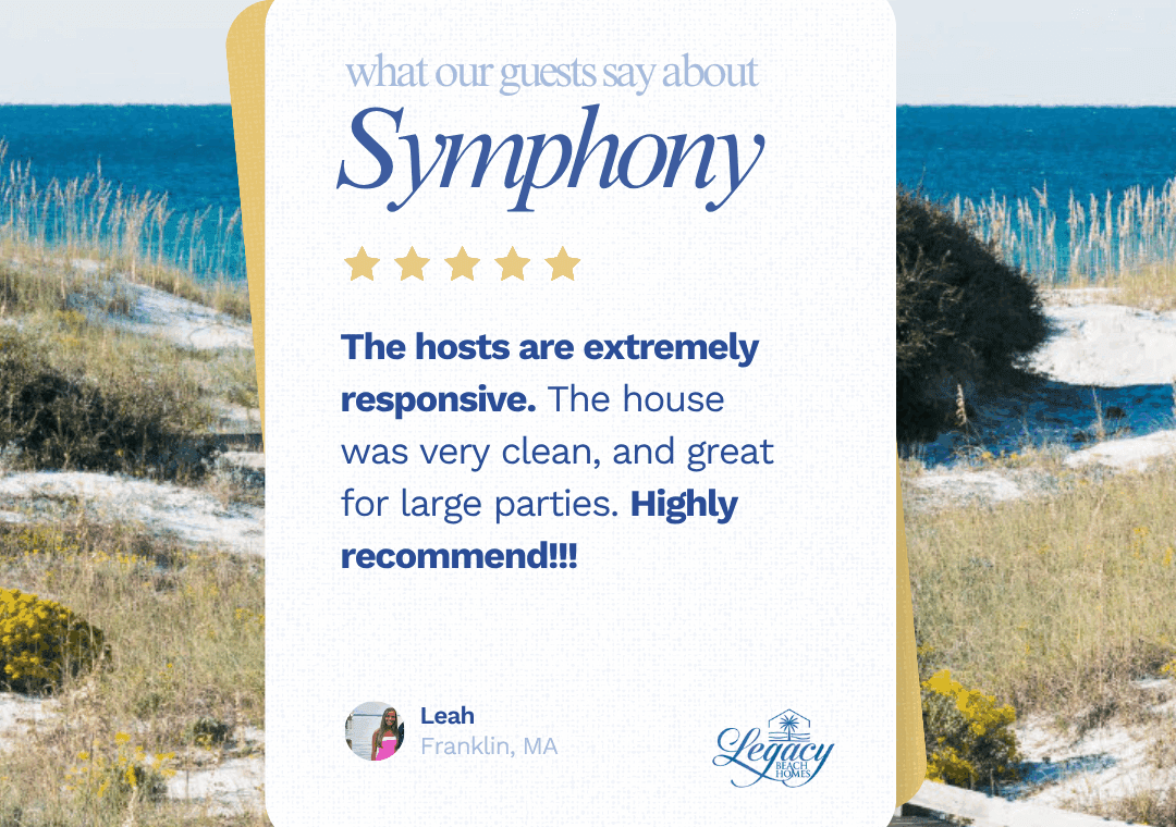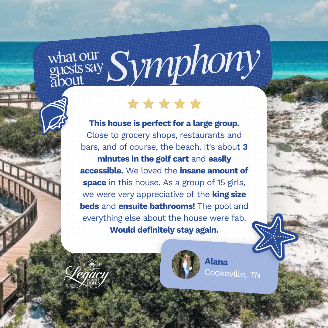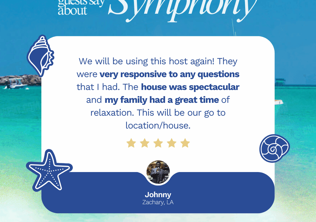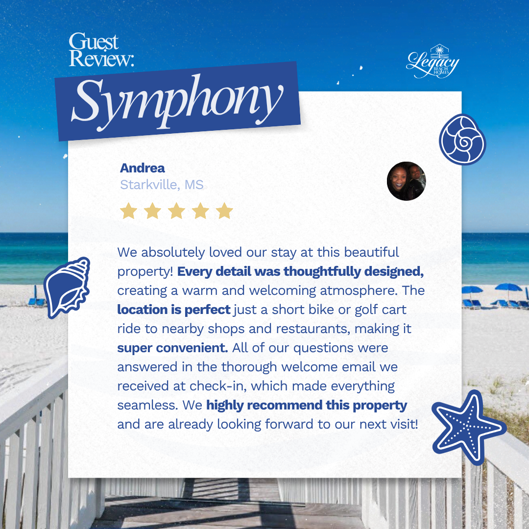 We had a great time staying at Symphony. There were 15 of us, and we all had plenty of space and felt really comfortable. The house was super clean and had everything we needed. The host was easy to communicate with and super helpful. Plus, the beach was just a short walk away. Wed definitely stay here again!