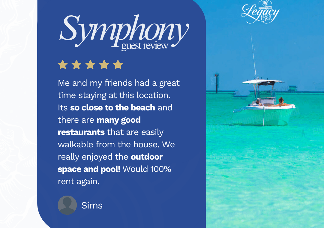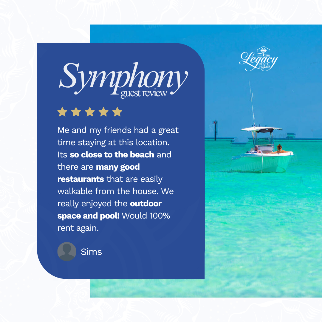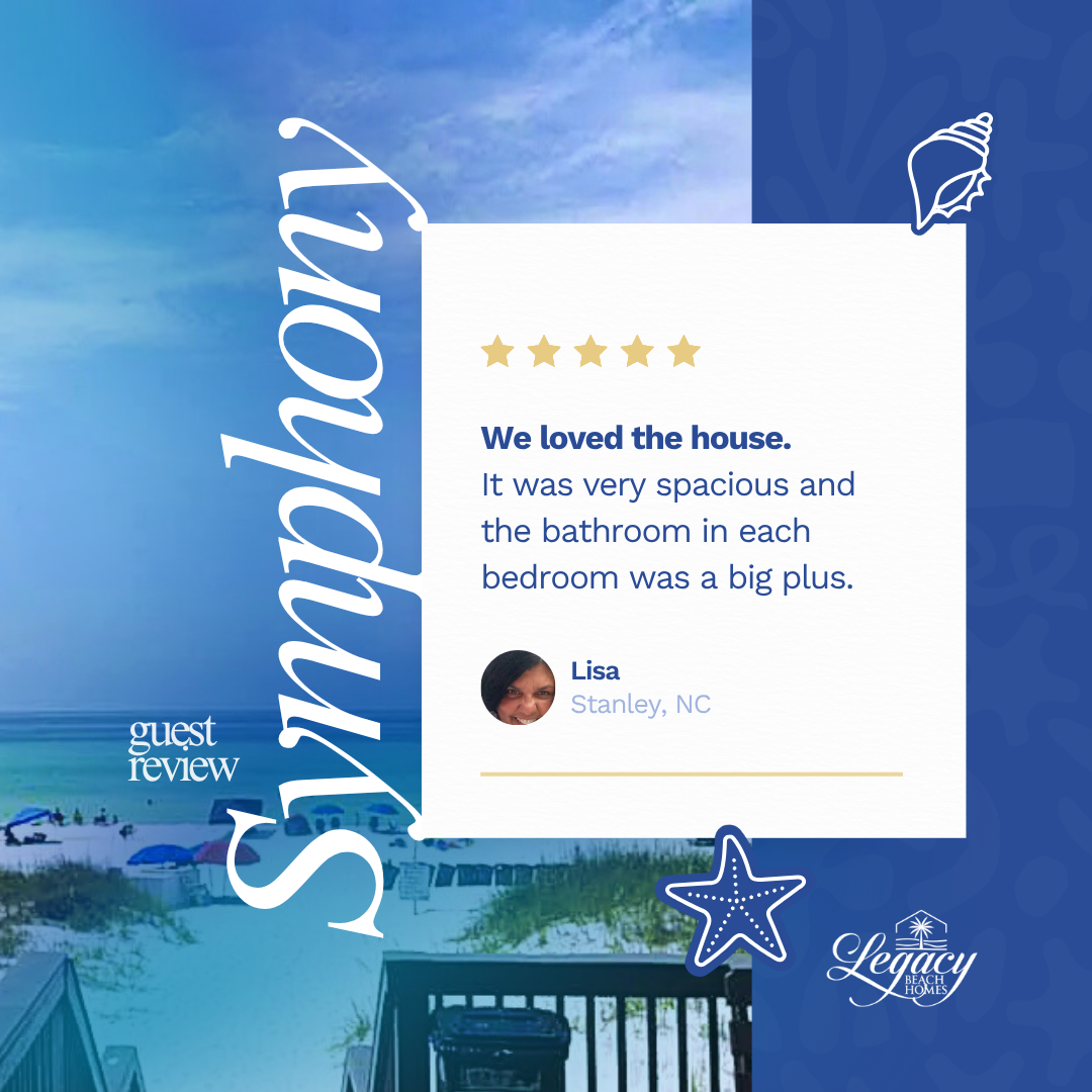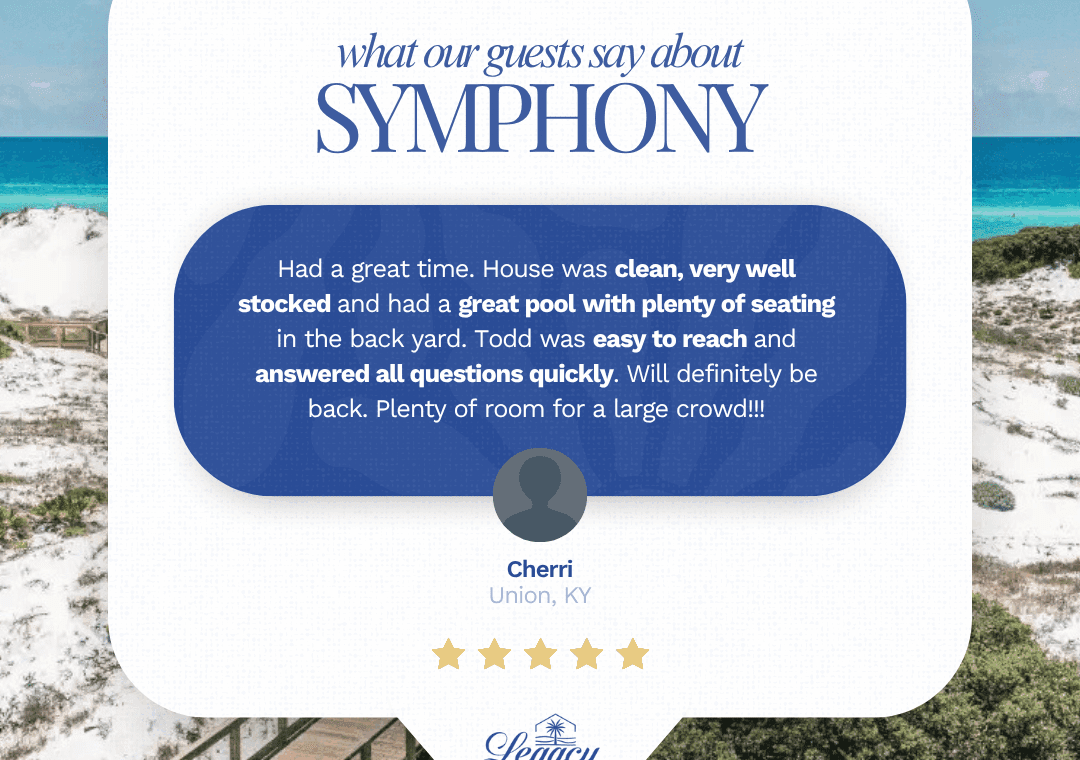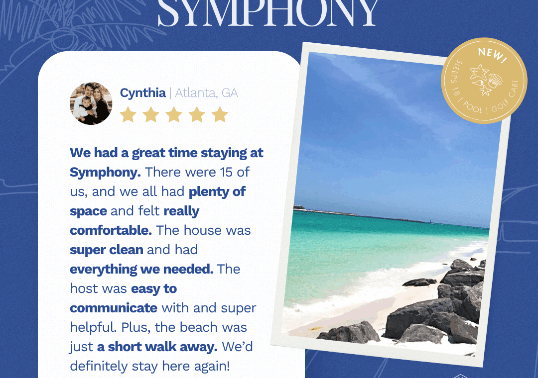 We had a great time staying at Symphony. There were 15 of us, and we all had plenty of space and felt really comfortable. The house was super clean and had everything we needed. The host was easy to communicate with and super helpful. Plus, the beach was just a short walk away. Wed definitely stay here again!